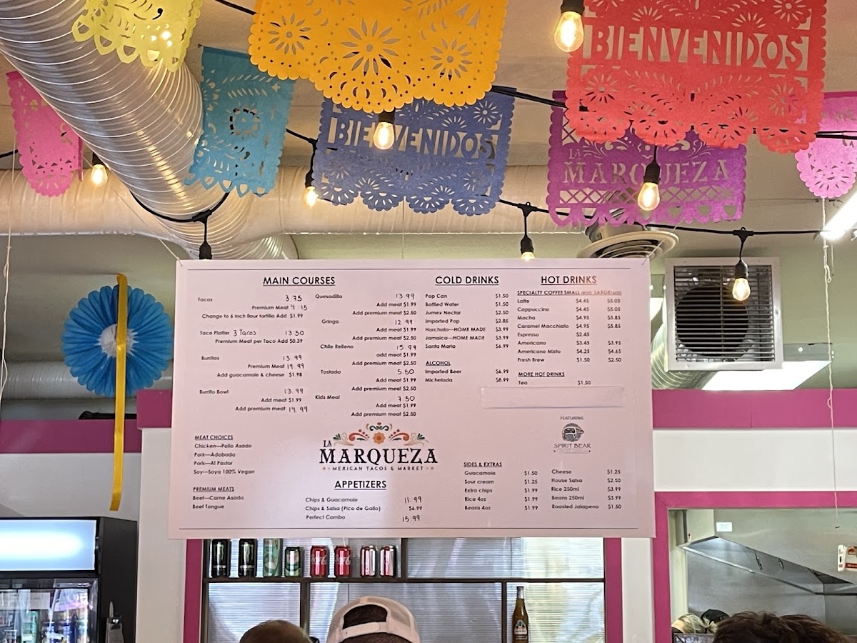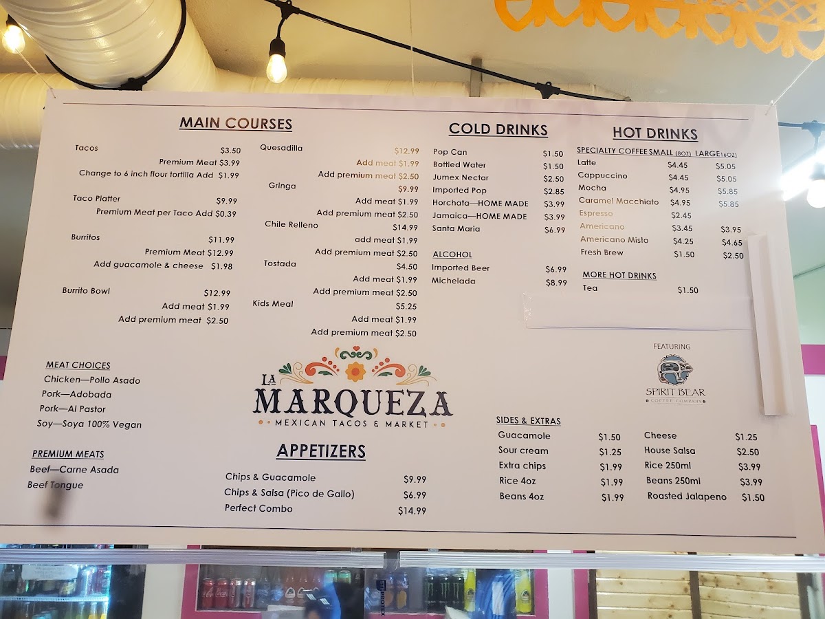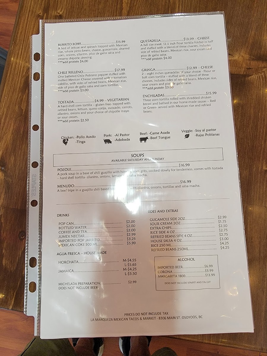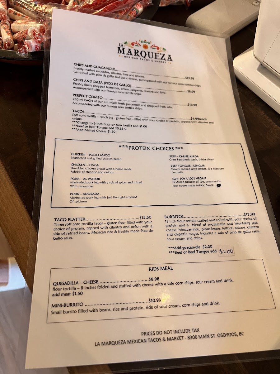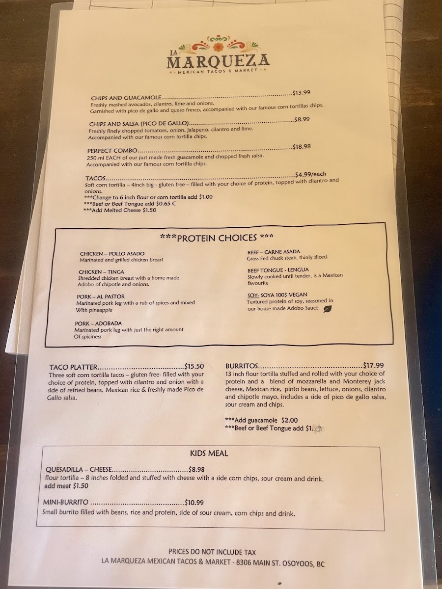 Welcome to La Marqueza Mexican Tacos & Market, a hidden gem located at 8526 Main St, Osoyoos, BC. This vibrant establishment serves up authentic Mexican cuisine, offering an enticing taco menu that features options like pollo asado, shredded chicken, and carne asada, all priced between CA$4.99 to CA$5.64.